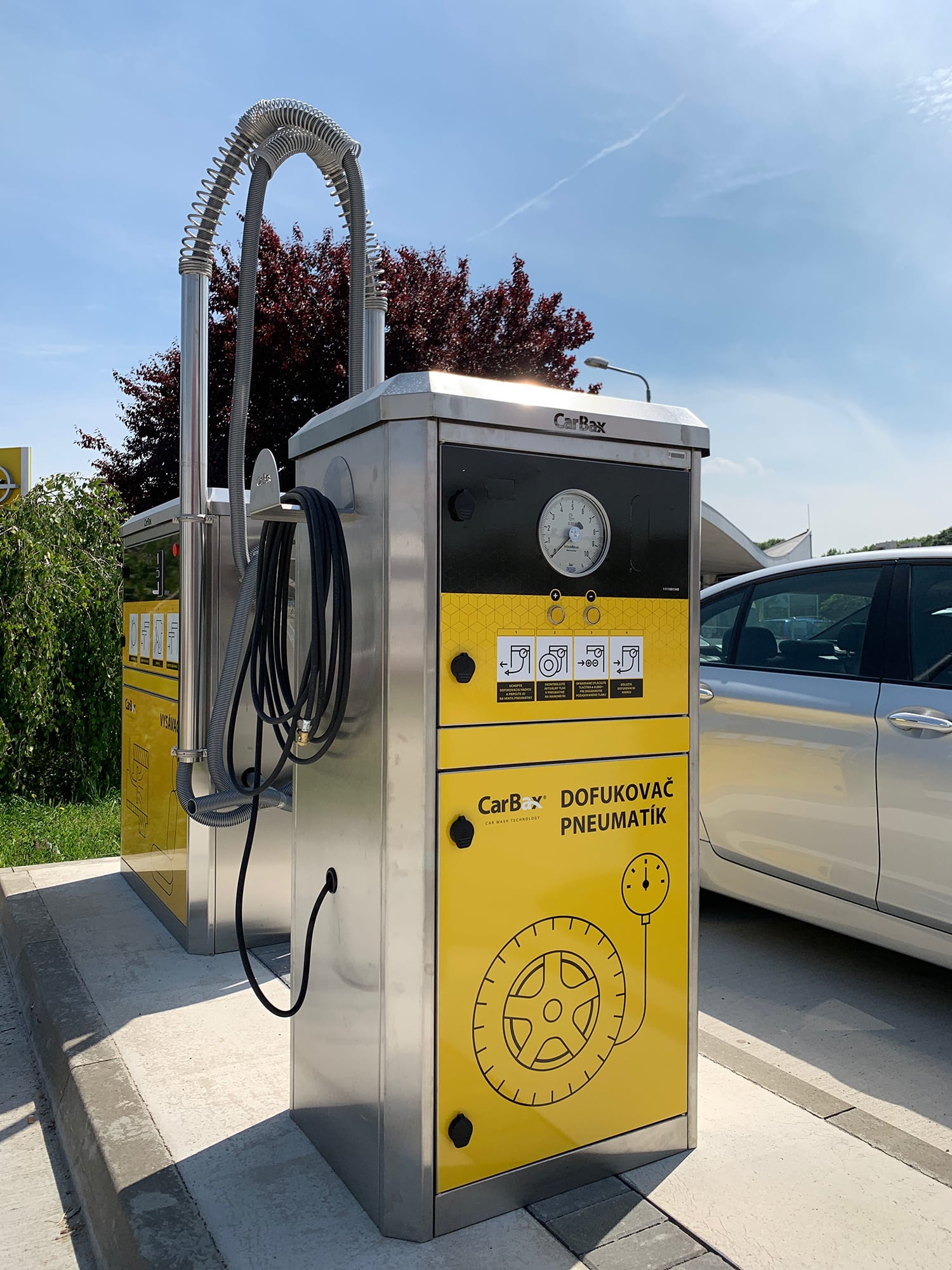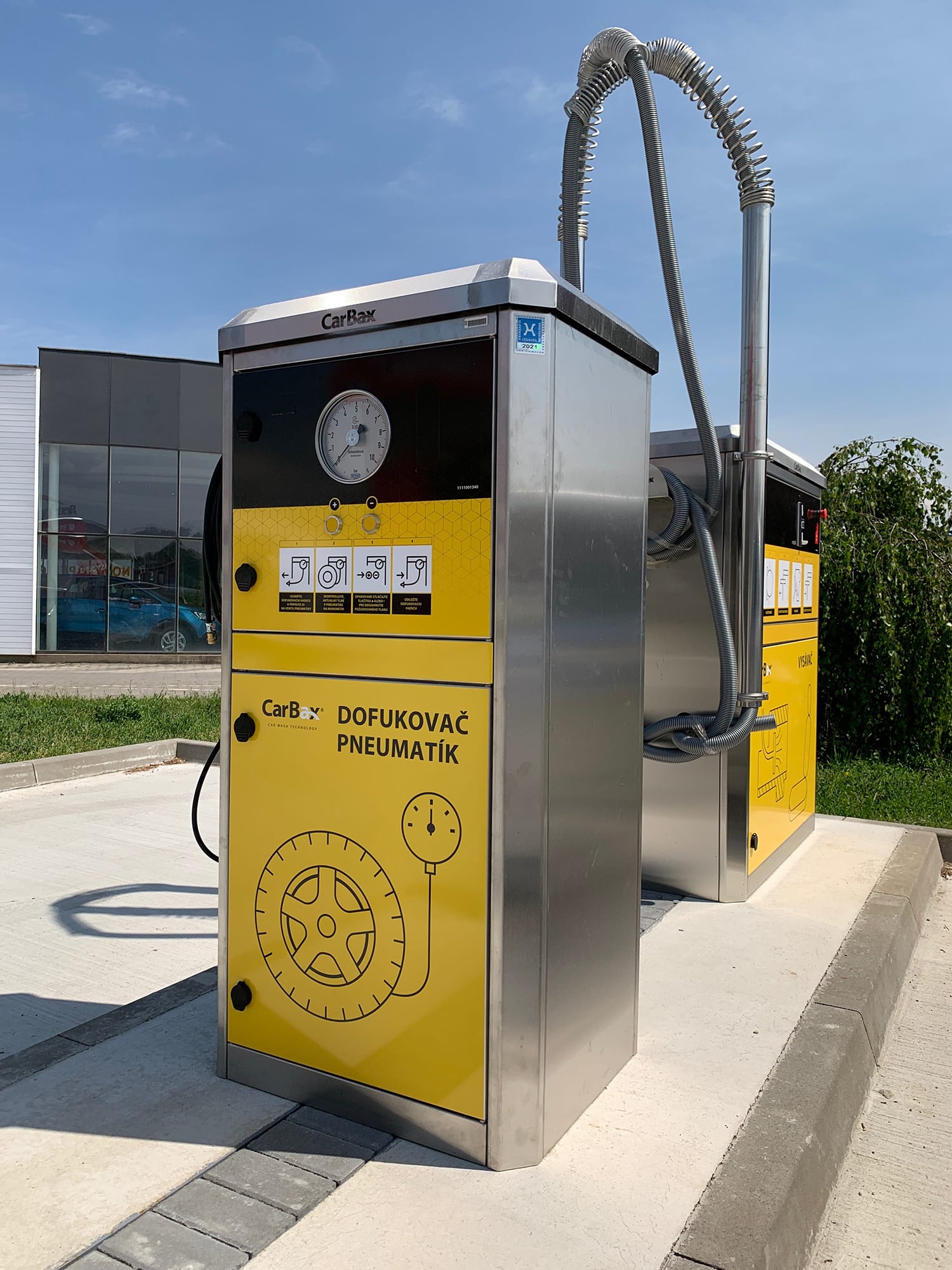 Samoobslužný dofukovač pneumatik CarBax Air navržený speciálně pro samoobslužné automyčky, čerpací stanice a parkoviště.